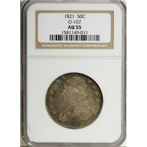 <B>1821 50C AU55 NGC.</B></I> O-107, R.3. Dusky sea-green, gold, and radish-red invigorate the margins of this lightly circulated but unmarked example. Aficionados of the series identify Overton-107 by the placement of star 7, which nearly touches the front of the cap.<BR><BR><B>Coin Engraver:</B> John Reich<BR><BR><b>Shipping:</b> Coins & Currency (<a target="_blank" href="http://www.heritageauctions.com/common/shipping.php">view shipping information</a>)