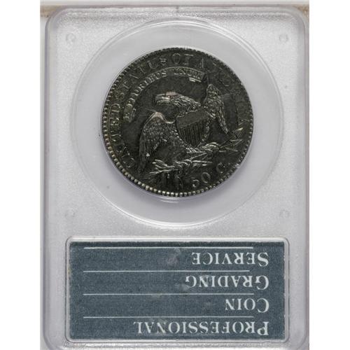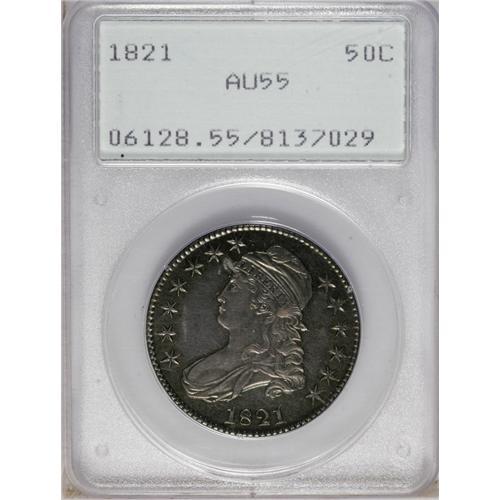 <B>1821<50C> AU55 PCGS.</B></I> O-106, R.1. The diagnostic die chip is noted in the N of UNITED, but it is not large enough to qualify as O-106a. A lightly clashed, Choice AU example with traces of wear on the highpoints and lovely cobalt-olive patina. Housed in an early holder.