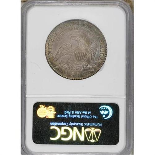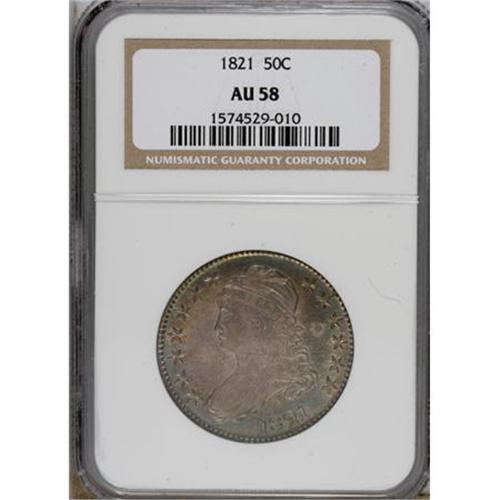 <B>1821 50C AU58 NGC.</B></I> O-105a, R.1. Dramatically toned gold, aquamarine, velvet-blue, and plum-red. A thin horizontal mark near star 2 is well concealed. Slight wear on the cap, drapery, and hair decides the grade.<BR><BR><b>Shipping:</b> Coins & Currency (<a target="_blank" href="http://www.heritageauctions.com/common/shipping.php">view shipping information</a>)