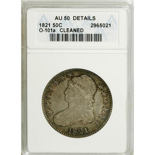 <B>1821 50C --Cleaned--ANACS. AU50 Details.</B></I> O-101a. NGC Census: (32/271). PCGS Population (35/235). Mintage: 1,305,797. Numismedia Wsl. Price for NGC/PCGS coin in AU50: $400. (#6128)<BR><BR><b>Shipping:</b> Coins & Currency (<a target="_blank" href="http://www.heritageauctions.com/common/shipping.php">view shipping information</a>)