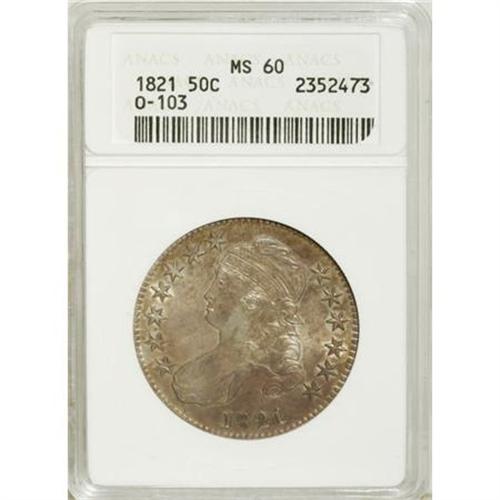 <B>1821 50C MS60 ANACS.</B></I> O-103, R.2. Orange-russet toning graces portions of this lustrous, attractive, and unmarked example. Minor fingerprints at 12 o'clock on the obverse and 7 o'clock on the reverse are barely worthy of mention.<BR><BR><B>Coin Engraver:</B> John Reich<BR><BR><b>Shipping:</b> Coins & Currency (<a target="_blank" href="http://www.heritageauctions.com/common/shipping.php">view shipping information</a>)