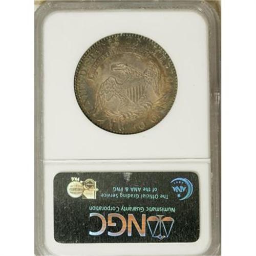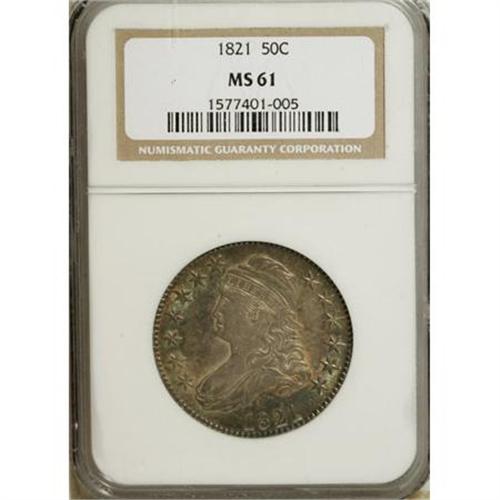 <B>1821 50C MS61 NGC.</B></I> O-103, R.2. The A's and E's of UNITED STATES OF AMERICA show defective serifs, and star 7 on the obverse points to Liberty's band, rather than her cap. This crisply detailed example has ocean-blue, rose, orange, and apple-green patina over softly lustrous surfaces.<BR><BR><B>Coin Engraver:</B> John Reich<BR><BR><b>Shipping:</b> Coins & Currency (<a target="_blank" href="http://www.heritageauctions.com/common/shipping.php">view shipping information</a>)