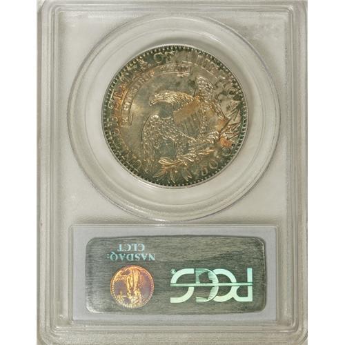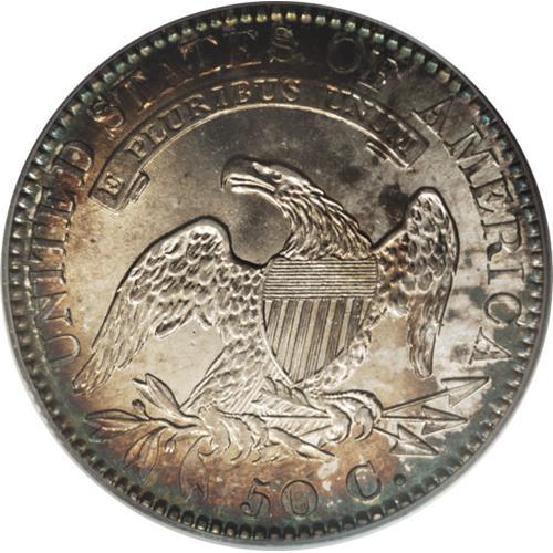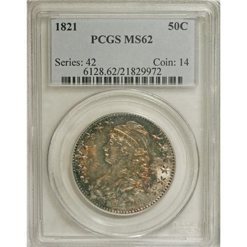 <B>1821 50C MS62 PCGS.</B></I> O-101a, R.1. A center dot on the neck, a double outline on the lower right side of the clasp, and a tyne on the lower part of the left (right facing) wing identify the variety, and the die crack above UNITED STAT confirms the later die state. Splashes of cobalt-blue, lavender, and golden-brown patina visit bright, lustrous surfaces. Sharply struck, well centered, and complete, bold dentilation. Some faint, inoffensive handling marks are noted on the obverse. A pretty coin!<BR><BR><b>Shipping:</b> Coins & Currency (<a target="_blank" href="http://www.heritageauctions.com/common/shipping.php">view shipping information</a>)