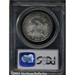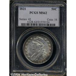 <B>1821<50C> MS62 PCGS.</B></I> O-103, R.4. Pleasing luster underlies silver-gray toning, with lavender and dark blue accents in the rim areas. Generally well struck, save for minor weakness in portions of Liberty's middle and lower hair curls. A few wispy hairlines are found in the left obverse fields and on Liberty's cheek, neck, and bust. All in all, this is an attractive Capped Bust half dollar. Population: 18 in 62, 29 finer (3/04). <BR><BR><B>Important notice:</B> Heritage usually auctions material at the rate of 200-250 lots per hour. On some occasions eBay Live bid software or the Internet may not be able to keep up with the pace of the auction. We recommend placing a realistic absentee bid now as insurance to avoid disappointment. Occasionally the auctioneer may eliminate or reject an eBay Live bid, and the auctioneer may also reopen a lot after the close of the eBay live bidding (usually because we missed an audience bid), and may reject your bid even if it shows you as the winning bidder. By bidding via eBay Live, you agree that Heritage may award the lot to another bidder at its sole discretion under the circumstances described above or any other reasonable circumstances. Since eBay bids are not shown to us until we open the lot on the floor, we treat those bids just like floor bids. In most cases the floor responds before the eBay bid is presented to us, due to Internet lag time, so for consistency we have made it a policy that floor bids are always considered first over tie eBay live bids. Also please note that all Heritage lots purchased through eBay Live carry a 20% Buyer's Premium. Please make sure you read the Terms and Conditions before you bid.