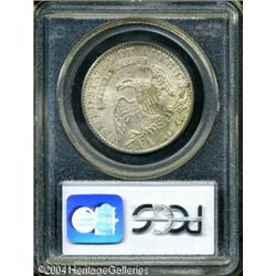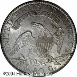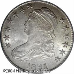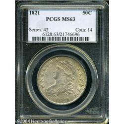 1821 50C MS63 PCGS. O-101a, R.1. Olive and pearl-g <B>1821 50C MS63 PCGS.</B></I> O-101a, R.1. Olive and pearl-gray patina endows this satiny and boldly struck Half Dollar. Beautifully preserved, the only blemish of any significance is a light pinscratch on the neck. Mint-made die cracks atop the reverse legend confirm the late die stage. Although worn examples are not elusive, the 1821 is a very scarce date in Select Mint State. Population: 15 in 63, 15 finer (11/04). <BR><BR><B>Important notice:</B> Heritage usually auctions material at the rate of 200-250 lots per hour. On some occasions eBay Live bid software or the Internet may not be able to keep up with the pace of the auction. We recommend placing a realistic absentee bid now as insurance to avoid disappointment. Occasionally the auctioneer may eliminate or reject an eBay Live bid, and the auctioneer may also reopen a lot after the close of the eBay live bidding (usually because we missed an audience bid), and may reject your bid even if it shows you as the winning bidder. By bidding via eBay Live, you agree that Heritage may award the lot to another bidder at its sole discretion under the circumstances described above or any other reasonable circumstances. Since eBay bids are not shown to us until we open the lot on the floor, we treat those bids just like floor bids. In most cases the floor responds before the eBay bid is presented to us, due to Internet lag time, so for consistency we have made it a policy that floor bids are always considered first over tie eBay live bids. Also please note that all Heritage lots purchased through eBay Live carry a 20% Buyer's Premium. Please make sure you read the Terms and Conditions before you bid. This lot is being auctioned in conjunction with a live floor auction by Heritage Galleries & Auctioneers. All final auction and invoice information will be supplied by Heritage Galleries & Auctioneers, and all other information should be considered preliminary. Lot:6060