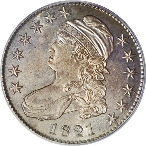 <B>1821 50C MS65 ICG.</B></I> O-107, R.3. Only seven varieties are known for the Capped Bust half dollars of 1821, and the O-107 is the only one of these that garners an R.3 rarity rating. Pale blue and lilac-brown colors are displayed across both sides of this unmarked piece. It is crisply struck throughout, and exhibits fully reflective prooflike fields. Although clearly not a proof example, the mirrored appearance of the fields intersect the devices without transition, and this is one trait that is considered for proof or specimen status. Not only is this a special coin that possesses excellent eye appeal, it is also one of the finer examples of this die marriage that we know of, and should garner a price in excess of the typical value for the date.<BR><I>From The Westmoreland, Virginia Collection, Part Two.</B></I><BR><BR><b>Shipping:</b> Coin/Currency (<a target="_blank" href="http://www.heritageauctions.com/common/shipping.php">view shipping information</a>)