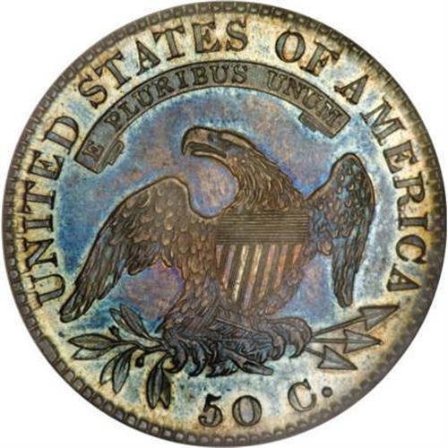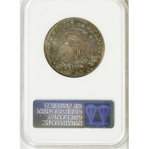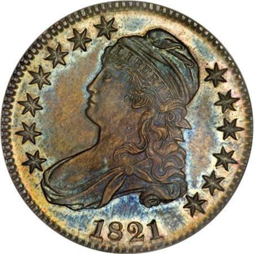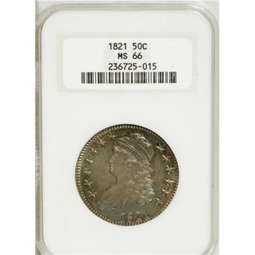 <B>1821 50C MS66 NGC.</B></I> O-103, R.2. Stars 1 and 13 virtually touch the bust tip and hair curl, and the well-spaced date is low. On the reverse the right serifs of the A's and the left serifs of the E's are missing, a reverse that was also used previously on the Overton-107 of 1820.<BR> This coin has the beautiful original "skin" that old-time collectors flock to (and new ones should, too), with semiprooflike surfaces graced by a mélange of ice-blue and pinkish-golden patina on both sides. This coin is tied for the finest certified of the date and could be the finest certified of the variety, generally considered a "common" one. There are four MS66 1821 coins, unattributed as to variety, at NGC, and among the attributed 1821s, only a single O-105a and an O-107 have attained such lofty grades. It is certainly worth noting that Stephen Herrman's auction price reference lists an MS64 as the finest sold in recent years, and a search through Heritage's auction archives shows that an MS62, surprisingly, is the finest of this "common" variety that we have auctioned since we began keeping records some dozen-plus years ago. A true prize for the Bust half specialists.<BR><BR><B>Coin Engraver:</B> John Reich<BR><BR><b>Shipping:</b> Coins & Currency (<a target="_blank" href="http://www.heritageauctions.com/common/shipping.php">view shipping information</a>)