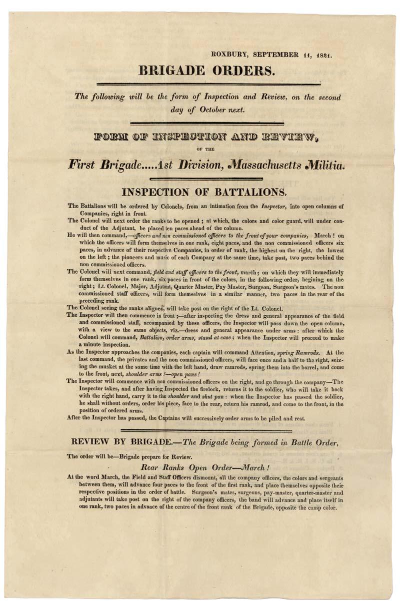 Printed Document. Three pages,10” x 15 1/8”. Roxbury. September 14, 1821. True, Green & Field, Printers, Boston. The document reads, in part: “ … The following will be the form of Inspection and Review, on the second day of October next … The Battalions will be ordered by Colonels, from and intimating from the Inspector, into open columns of Companies, right and front … The Inspector approaches the companies, each captain will command Attention, spring Ramrods. At the last command, the privates and non commissioned staff, will face once and a half to the right, seizing the musket at the same time with the left hand, draw ramrods, spring them into the barrel, and come to the front, next, shoulder arms! - open pans! … At the word March, the Field and Staff Officers dismount, all the company officers, the colors and sergeants between them, will advances four paces to the front of the first rank, and place themselves opposite their respective positions in the order of battle … THE BRIDGADE WILL PASS IN REVIEW … MANOEUVRES OF BATTALTIONS … EVOLTUION OF THE LINE ... It is expect that every officer will make himself so familiar with his duty, that he will be able to give all orders, promptly, and see that they are correctly understood and faithfully executed. The utmost confidence s reposed in the zeal and martial disposition of the officers of the Brigade, to render the day honorable to themselves and the Commonwealth …” Usual folds. Overall Extremely Fine.