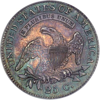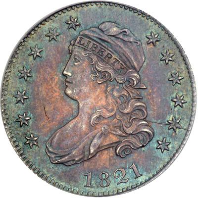 1821 Capped Bust Quarter Dollar. PCGS graded MS-65. A sensational gem. Shades of golden, magenta, and bluish green toning are noticeable throughout. An unbelievably lustrous gem with sizzling frost beneath the rich toning. The reverse and obverse centers play host to a crisp detail and originality always appreciated by the stronger buyers. Full sharp stars and legends. In short, a lovely coin, one that certainly meets the qualifications of MS65 grade, and then some. Pop 6; 5 finer, 4 in 66, 1 in 67 (PCGS # 5331) .