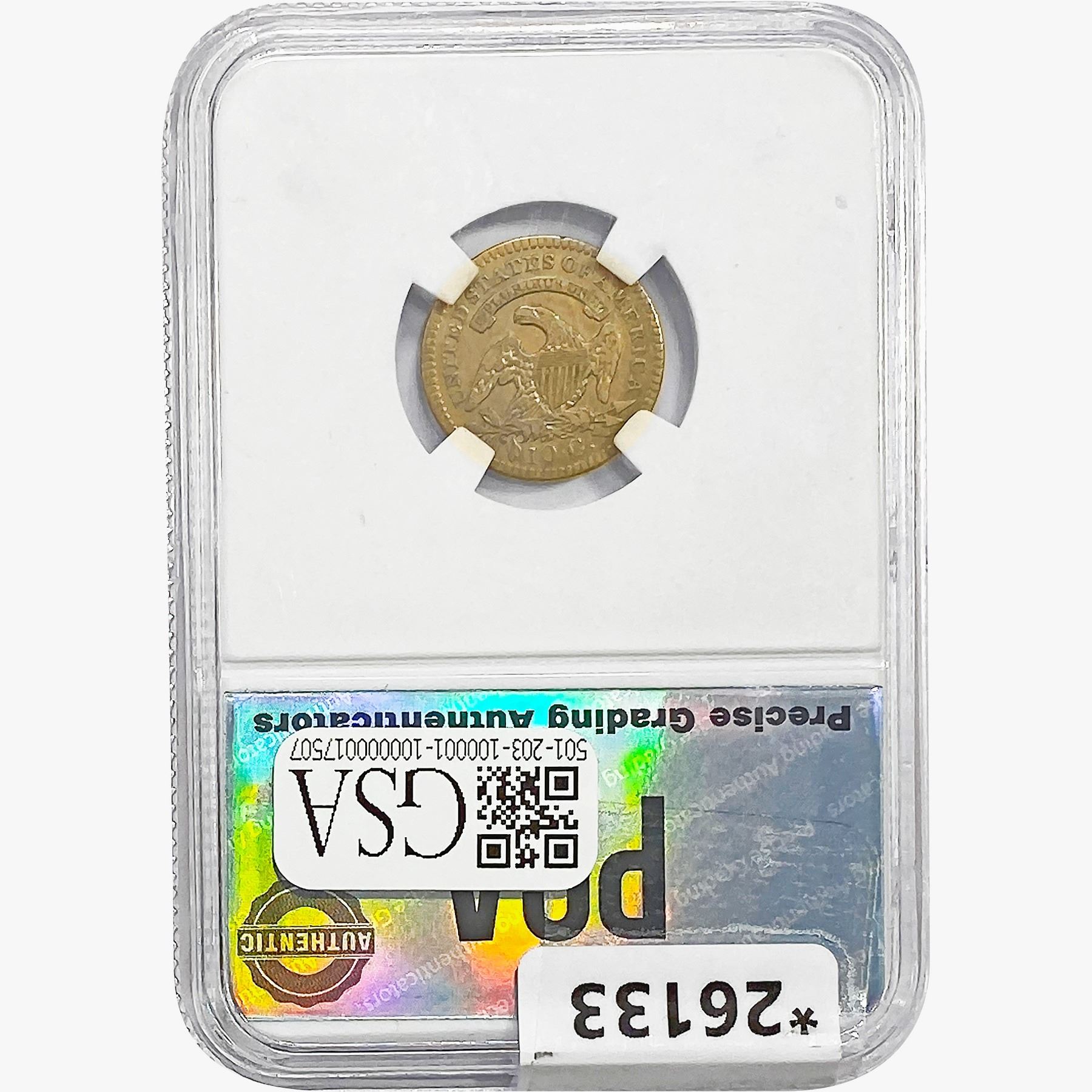 l. All non-certified coins and currency are guaranteed genuine, but are not guaranteed as to grade, since grading is a matter of opinion, an art and not a science, and therefore the description rendered by GSA or any third-party grading service may not agree with the opinion of others (including trained experts), and the same expert may not grade the same item with the same grade at two different times. GSA may, but is not obligated to, express an opinion as to non-certified numismatic items, in GSA’s opinion, or by its employees’ experience and the current interpretation of the American Numismatic Association’s standards as of the date the catalog was prepared. There is no guarantee or warranty expressed or implied that the grading opinions utilized by GSA, if any, will meet the standards of any grading service at any time in the future.