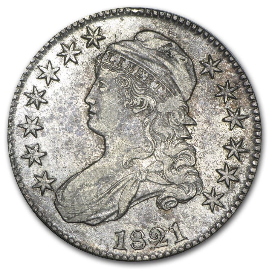 1821 Capped Bust Half Dollar AU-55. White surfaces blend with pale purple on this nice, original bust half. No major marks and just light wear with original mint luster.