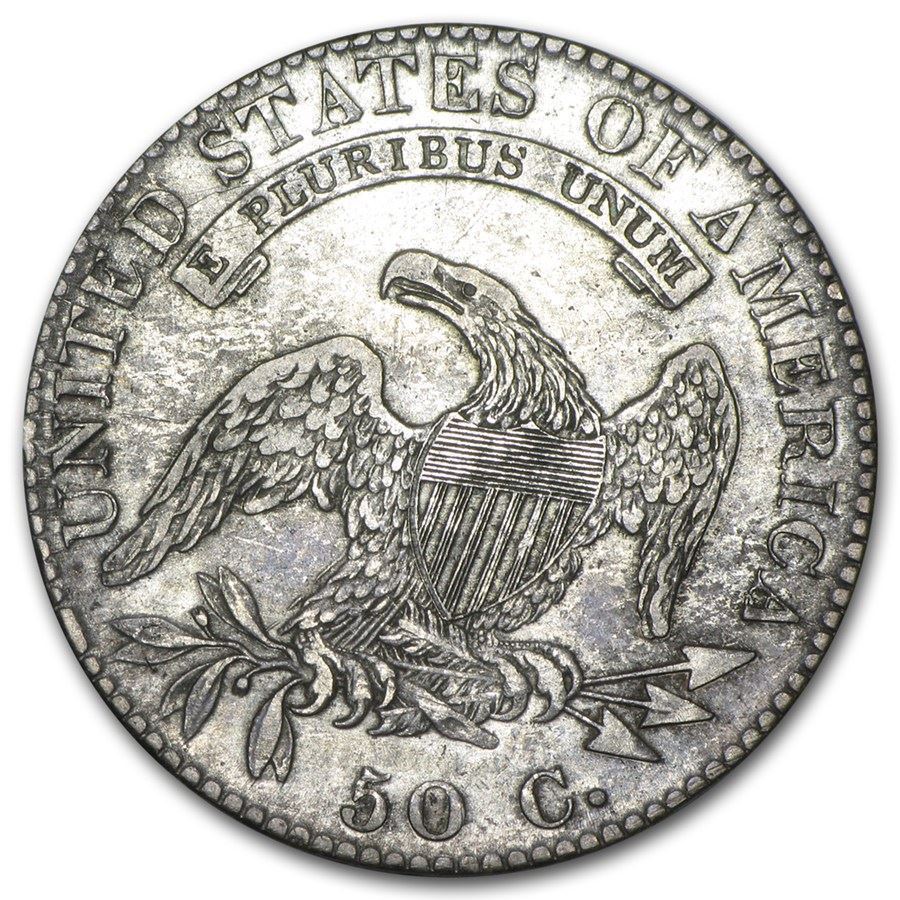 1821 Capped Bust Half Dollar AU-55. White surfaces blend with pale purple on this nice, original bust half. No major marks and just light wear with original mint luster.