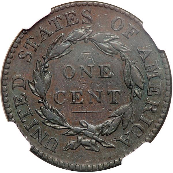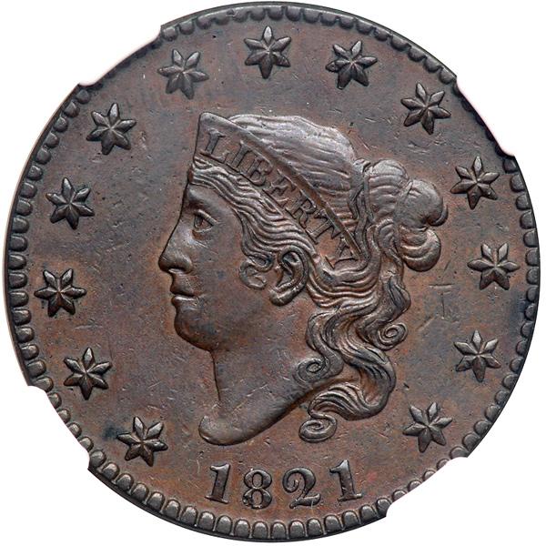 1821 N-1 R1. NGC graded EF-45. Glossy chocolate and olive brown with frosty lighter steel brown toning in protected areas. This cent looks quite nice to the unaided eye, but a glass reveals that the obverse details, including the stars and hair, were expertly strengthened. The work was done with exceptional skill, hence the grade assigned by NGC. The color is not original, of course, but it is very attractive. MDS with a fine die crack from the I in UNITED to the C in AMERICA. Our grade is VF30 sharpness net F15.