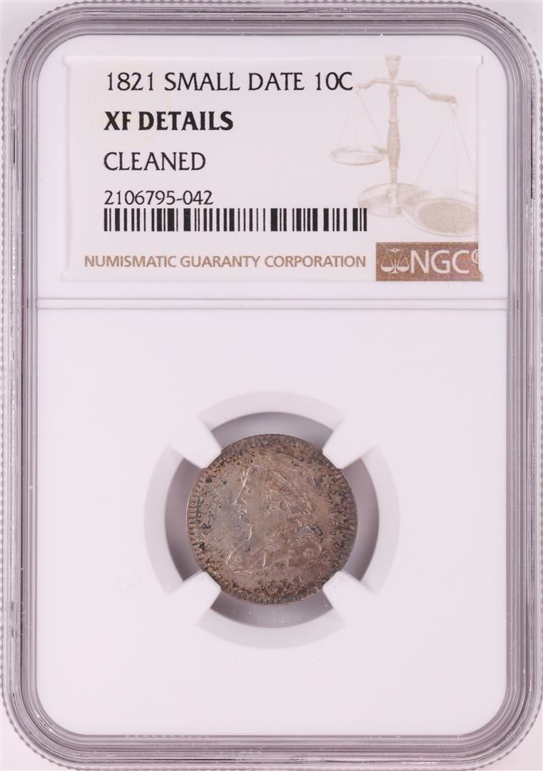 One 1821 Small Date Capped Bust Dime Coin NGC XF Details. NGC Certified.