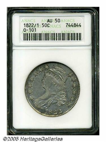 <B>1822/1<50C> AU50 ANACS.</B></I> O-101, R.1. Silver-gray surfaces display wisps of ice-blue and light golden-brown patina, and traces of luster in the protected areas. The design elements are well defined, and centered on the planchet. A few minute marks scattered about are not bothersome.