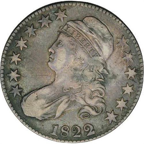 <B>1822/1<50C>--Improperly Cleaned--NCS. VF Details.</B></I> O-102, High R.4. Later die state with the cracks listed in Overton faint but clearly discernible with a magnifier. The surfaces are a bit bright from an old cleaning but have nicely retoned and appear natural at arm's length. The fields and other recesses are medium to darker gray with pinkish-tan highpoints over the devices where friction is most apparent.<BR><I>Ex: Don Frederick (1/30/1980).</B></I> Envelope Included.