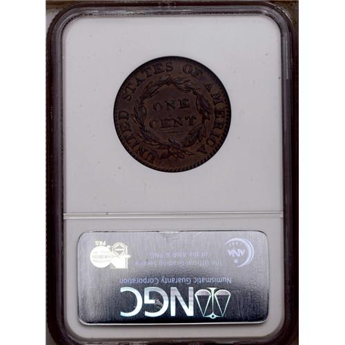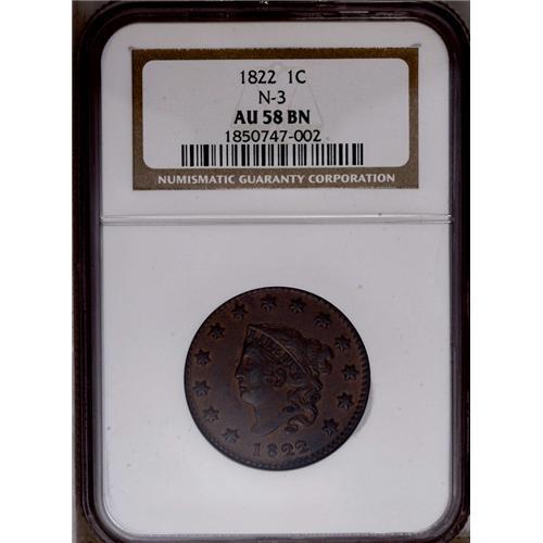 <B>1822<1C> AU58 NGC.</B></I> N-3, High R.2. Noyes Die State B. The date is spaced 1 8 22. Chocolate-brown and gunmetal-blue shades alternate across this problem-free Matron Head cent. The stars are bluntly struck, but the eye appeal is impressive. EAC 45.