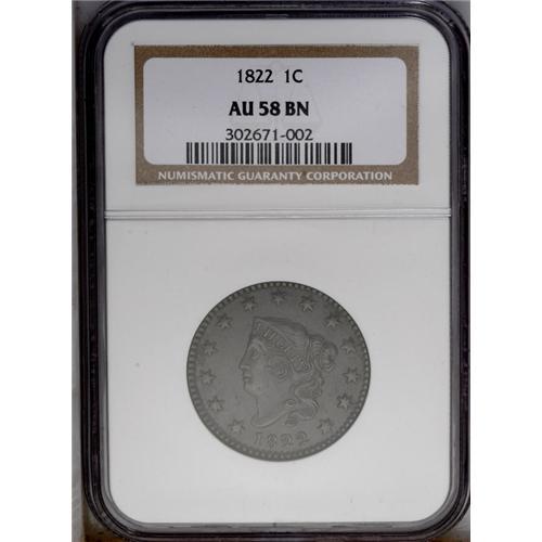 <B>1822 1C AU58 NGC.</B></I> N-5, R.2. Deep steel-brown surfaces with considerable luster. Both sides have light abrasions and minor raised verdigris, the latter probably removable with a little care. Although this variety is not rare, it is seldom encountered in higher grades. Of course, the same could be said for any 1822 large cent. EAC 40.