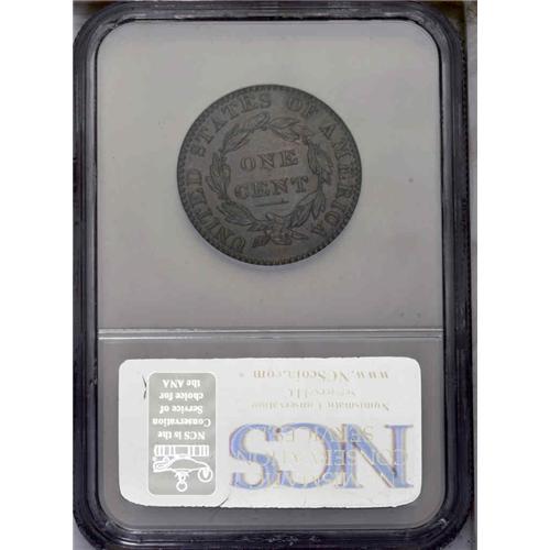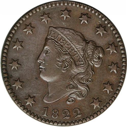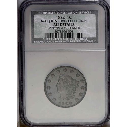 <B>1822<1C> N-11, R.3--Improperly Cleaned--NCS. AU Details. XF40 EAC.</B></I> A strong inner circle appears at the rim on the upper left side of the obverse and a large E in STATES is above the T. A thin scratch extends from star 1 through the obverse field nearly to star 5 and two parallel marks are seen at the base of Liberty's neck. The glossy surfaces appear to have been lightly cleaned at one time.<BR><I>Ex: George Ramont (3/1/1967).</B></I> Envelope Included.