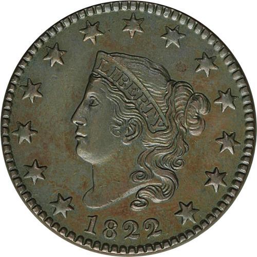<B>1822<1C> N-5, R.3--Improperly Cleaned--NCS. AU Details. AU50 EAC.</B></I> Rust pits show on Liberty's neck near her ear, and the T of LIBERTY is noticeably larger than the other letters. A well detailed example that was lightly cleaned at one time. The surfaces now present an olive-brown appearance with russet accents.<BR><I>Ex: Dr. Kenneth J. Sartoris; Del Bland (5/19/1972).</B></I> Envelope Included.