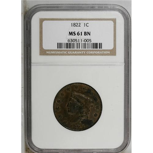 <B>1822<1C> MS61 Brown NGC.</B></I> N-4, R.2. The inner circle is plain on this nicely struck piece. The medium brown surfaces have several darker areas, particularly to the right of the date and between stars 8 and 9. EAC 50.