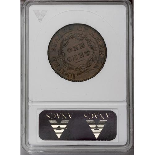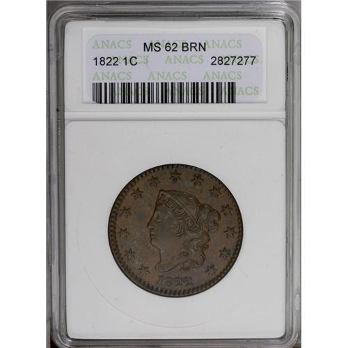 <B>1822<1C> MS62 Brown ANACS.</B></I> N-1, R.3. A mostly golden-brown example with a few obverse aqua dashes and a couple of darker areas on each side. The shimmering surfaces are unmarked, and the strike is above average. EAC 40.