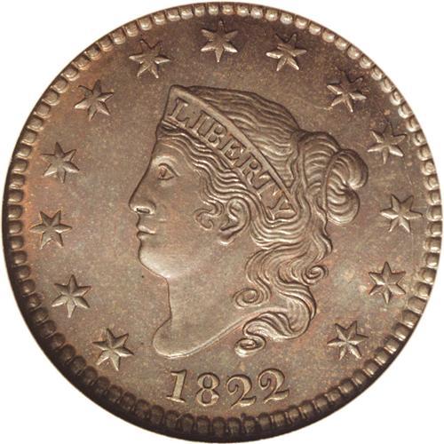 <B>1822<1C> MS62 Red and Brown ANACS.</B></I> N-2, Low R.3. Splendidly struck on the portrait and wreath, and only a few upper left stars lack crisp centers. Sea-green toning dominates, although orange and rose peer from selected areas. A die crack connects most right side stars, as usual for the N-2 variety. EAC 50.