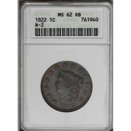 1822 1C MS62 Red and Brown ANACS. N-2, Low R.3. Splend 1822[1C] MS62 Red and Brown ANACS.