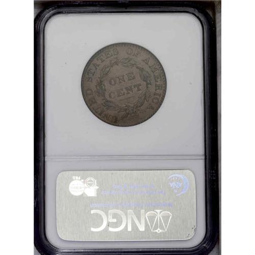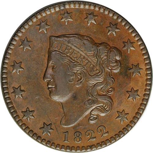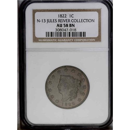 <B>1822<1C> N-13, R.5. AU58 NGC. XF40 EAC.</B></I> This is the finest known example of the variety, and an attractive one at that. <B>It is the Wright plate coin for the variety, and also the Noyes plate coin.</B></I> It is lightly cracked on the obverse from the upper border through star 7 and on to BE of LIBERTY. This die variety was discovered by Willard C. Blaisdell in 1947, and remains elusive today. According to John Wright, this example, which remains finest known, was the third example of the variety to be located. Today, perhaps 50 or so examples survive, although most are in low grades. In fact, after this single XF example, the Condition Census drops off sharply, with the sixth best grading just Fine 15.<BR><I>Ex: Norman Schultz; Garry Fitzgerald (11/13/1968).</B></I> Envelope Included.