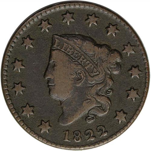<B>1822<1C> N-9, Low R.5--Corroded--NCS. VF Details. VG7 EAC.</B></I> This is a rare variety with quite a low Condition Census. Finest known is just XF, and the top two dozen examples range down to the level of this coin, although the Reiver Collection specimen is not included in the Noyes Census. This is apparently an early die state, without any trace of the crack through the tops of TES, although that crack may be obscured by the surface corrosion. Dark steel surfaces tend toward olive, with light tan color on the high points of the design. Although the corrosion on the surface of both the obverse and reverse is significant, it is rather evenly distributed and therefore, not overly objectionable. An important opportunity for the advanced specialist.<BR><I>Ex: Garry Fitzgerald (11/13/1968).</B></I> Envelope Included.