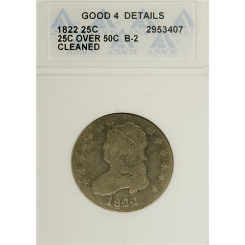 <B>1822 25C 25/50C--Cleaned--ANACS. Good 4 Details.</B></I> B-2, R.5. The over-denomination details are clear despite its long stay in circulation. The reverse is noticeably sharper than the obverse, although the date is bold, and all stars are outlined. Bright from a cleaning, and the cloudy surfaces are minutely granular.<BR><BR><b>Shipping:</b> Coins & Currency (<a target="_blank" href="http://www.heritageauctions.com/common/shipping.php">view shipping information</a>)