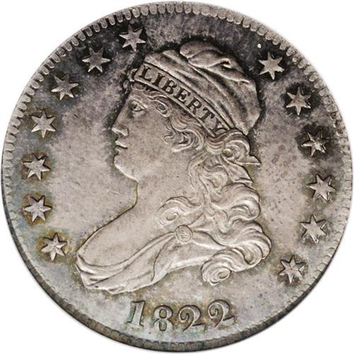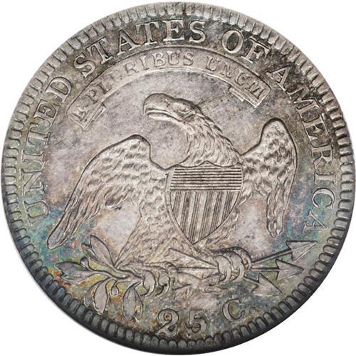 <B>1822<25C> 25/50C MS66 NGC.</B></I> Ex: Eliasberg. B-2, High R.5. Apparently the Finest Known of this extremely popular variety coming in a notch above two Gem MS65 coins reported, one by PCGS, the other by NGC. The toning is a delight to behold for any experienced collector with lilac-gray throughout mixed with splashes of blue and yellow-gold near the devices. Many of the silver coins from the Eliasberg Collection had toning that matched this present coin as they were stored in the same type of holders and environment for decades. The devices are frosty while the fields show prooflike reflectivity except for a small satiny area before Liberty's neck surrounding a small nick. It is all but certain that this coin was struck soon after the handful of proofs were made from this pair of dies, as the present coin is an early die state and shows so many of the characteristics of a proof. Walter Breen considered this particular coin to be a proof, others a business strike. As to the strike, the central devices and legends are sharp save for the uppermost portions of the talons on the eagle, and the obverse stars generally lack their radial lines except for star 10 which is sharp, matching the characteristics of the proofs from this die pairing.<BR><BR> This is one of the most famous engraving errors in American numismatics. The die engraver used the denomination punches for half dollar, and first engraved 50 C. instead of 25 C. Realizing the mistake, he corrected this by engraving the correct 25 over the 50, but he first placed the 5 punch way too low on the die, with the loop of the 5 into the dentils. The 5 punch was moved into proper position, and the denomination was finally corrected. Breen suspects that ailing Robert Scot was the engraver of this blundered die, and this conjecture would fit the evidence. A question comes to mind as to why this reverse die was employed to coin proofs for the year--especially when proofs are known of the perfect die 1822 quarter. We're these blundered die proofs struck first, or later when additional proofs were needed? Both share the same obverse die, perhaps the new perfect reverse die was not prepared until after the initial proofs were struck using the blundered die. The answer lies in careful study of the few proofs from each die pairing, to figure out which came first based on the condition of the obverse die. What is known, is that the 25/50 blundered reverse die has proven to be one of the most coveted of the Capped Bust quarters. Remarkably, the Philadelphia Mint shelved this die after the small issue of proofs and general circulation strikes in 1822, only to resurrect this same reverse and strike more quarters with it in 1828.<BR><I>Ex: Louis E. Eliasberg Collection (Bowers and Merena, 4/1997), lot 1385.</B></I><BR><I>From The Larj Collection.</B></I>