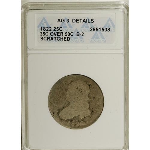 <B>1822 25C 25C Over 50C--Scratched--ANACS. AG3 Details.</B></I> B-2, R.5. In spite of heavy wear, the overdenomination is plain. A long scratch crosses the left (facing) wing on the gold-gray reverse.<BR><I>From The Reginald Byron Mason Collection.</B></I><BR><BR><b>Shipping:</b> Coins & Currency (<a target="_blank" href="http://www.heritageauctions.com/common/shipping.php">view shipping information</a>)