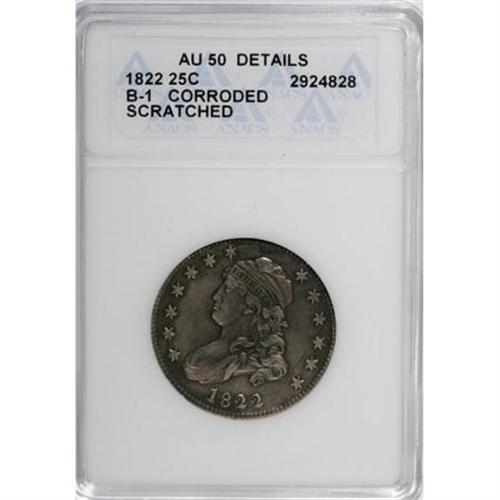 <B>1822 25C --Corroded, Scratched--ANACS. AU50 Details.</B></I> B-1, R.2. Only two die marriages are known for the 1822. B-2 is the rare 25/50C variety, which focuses date collector demand on B-1. This example has a granular obverse. The reverse has been carefully cleaned to reduce granularity. An intermittent thin, straight obverse scratch is noted between 3 and 5 o'clock.<BR><BR><B>Coin Engraver:</B> John Reich<BR><BR><b>Shipping:</b> Coins & Currency (<a target="_blank" href="http://www.heritageauctions.com/common/shipping.php">view shipping information</a>)
