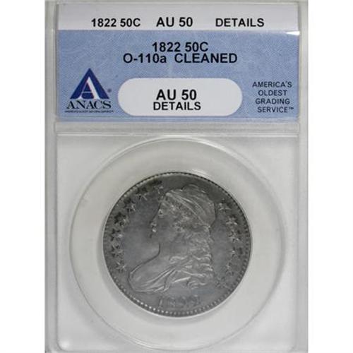 <B>1822 50C --Cleaned--ANACS. AU50 Details.</B></I> O-110A. NGC Census: (25/332). PCGS Population (39/322). Mintage: 1,559,573. Numismedia Wsl. Price for NGC/PCGS coin in AU50: $300. (#6129)<BR><BR><B>Coin Engraver:</B> John Reich<BR><BR><b>Shipping:</b> Coins & Currency (<a target="_blank" href="http://www.heritageauctions.com/common/shipping.php">view shipping information</a>)