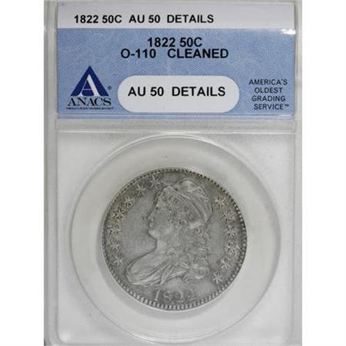 <B>1822 50C --Cleaned--ANACS. AU50 Details.</B></I> O-110. NGC Census: (25/332). PCGS Population (39/322). Mintage: 1,559,573. Numismedia Wsl. Price for NGC/PCGS coin in AU50: $300. (#6129)<BR><BR><B>Coin Engraver:</B> John Reich<BR><BR><b>Shipping:</b> Coins & Currency (<a target="_blank" href="http://www.heritageauctions.com/common/shipping.php">view shipping information</a>)