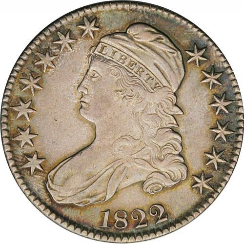 <B>1822<50C>--Improperly Cleaned--NCS. AU Details.</B></I> O-106a, R.3. The diagnostic die cracks on this variety extend through the digits in the date, with a second crack connecting the bust with stars one through seven. The reverse is in an intermediate die state, with a crack just joining the olive leaves with UN but not yet traveling through ITED STA as Overton describes. The fields of the present example are a bit too glossy from cleaning. The color is an attractive medium silver-gray, however, and some glints of color, chiefly copper and aqua, shine from the peripheries. Examination with a glass reveals numerous small, grade-consistent marks and field chatter, with moderate die erosion. Envelope Included.