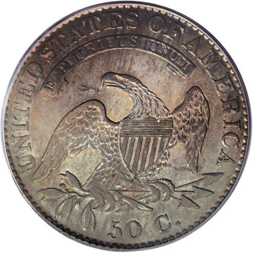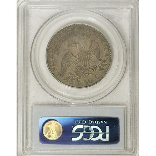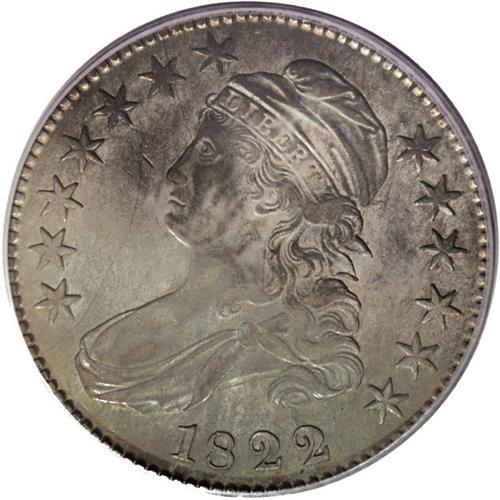<B>1822 50C AU50 PCGS.</B></I> O-103a, low R.5. This rare variety is confirmed by the following diagnostics: recutting at three lower points of star 10, the right side of the I in PLURIBUS in line with the right side of the second t in STATES, and a large center dot between crossbars 4 and 5 on the shield. A crack from the edge through upper points of star 6 to the bridge of the nose, and another joining the top date digits left to the drapery confirm the later die state. Light gray surfaces display yellow-green and lilac accents, the latter being most noticeable on the reverse, and retain traces of luster in the protected areas. Strong definition is noted on the design elements, save for typical softness on some of the star centers. A hair-thin mark is noted in the left obverse. Overall, a very sharp Bust half. Kraft envelope inscribed "1822, 50c, 13.00, 16, die crack" included.<BR><BR><b>Shipping:</b> Coins & Currency (<a target="_blank" href="http://www.heritageauctions.com/common/shipping.php">view shipping information</a>)