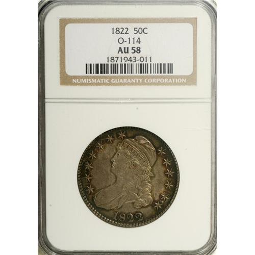 <B>1822 50C AU58 NGC.</B></I> O-114, R.3. Satin luster graces this splendidly detailed and moderately abraded lilac, tan-gold, and apple-green example. Wispy obverse marks are only visible with the aid of a loupe.<BR><I>From The Rocky Top Collection of Bust Half Dollars.</B></I><BR><BR><b>Shipping:</b> Coins & Currency (<a target="_blank" href="http://www.heritageauctions.com/common/shipping.php">view shipping information</a>)