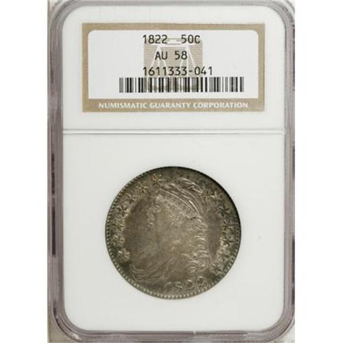 <B>1822 50C AU58 NGC.</B></I> O-107. NGC Census: (88/166). PCGS Population (43/166). Mintage: 1,559,573. Numismedia Wsl. Price for NGC/PCGS coin in AU58: $625. (#6129)<BR><BR><B>Coin Engraver:</B> John Reich<BR><BR><b>Shipping:</b> Coins & Currency (<a target="_blank" href="http://www.heritageauctions.com/common/shipping.php">view shipping information</a>\)