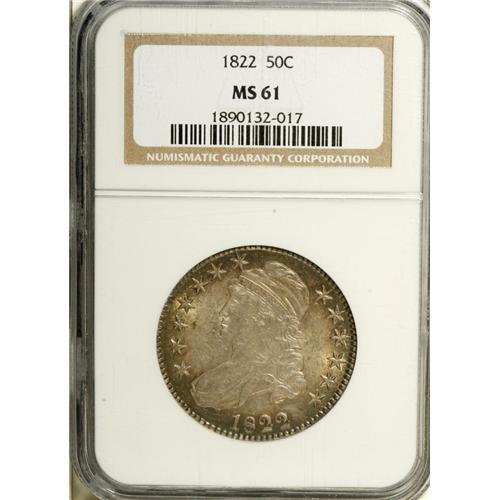 <B>1822 50C MS61 NGC.</B></I> O-109, R.2. Light aquamarine peripheries frame the medium tawny-gold and plum-gray centers. This satiny and attractive piece is sharply struck, and has only one noticeable mark, beneath the left scroll end.<BR><BR><b>Shipping:</b> Coin/Currency (<a target="_blank" href="http://www.heritageauctions.com/common/shipping.php">view shipping information</a>)
