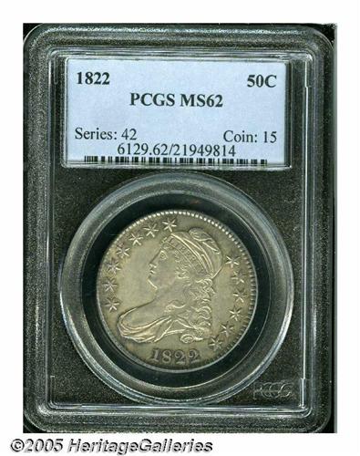 <B>1822<50C> MS62 PCGS.</B></I> O-107, R.2. A "button" at the folded down crown of the cap is unique and diagnostic to this variety. Well struck, lustrous, and carefully preserved, with lovely original coloration over both sides, and essentially mark-free surfaces on obverse and reverse alike.<BR><I>From the Dr. Kurt Peters Collection.</B></I> From the Dr. Kurt Peters Collection.