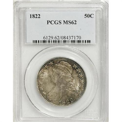 <B>1822 50C MS62 PCGS.</B></I> O-113, R.3. A well struck and highly attractive bust half. Jade-green, lilac, and almond-gold embrace the lustrous and unmarked surfaces. An excellent candidate for the collector of quality.<BR><BR><B>Coin Engraver:</B> John Reich<BR><BR><b>Shipping:</b> Coins & Currency (<a target="_blank" href="http://www.heritageauctions.com/common/shipping.php">view shipping information</a>)