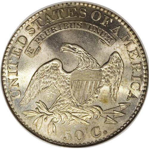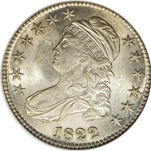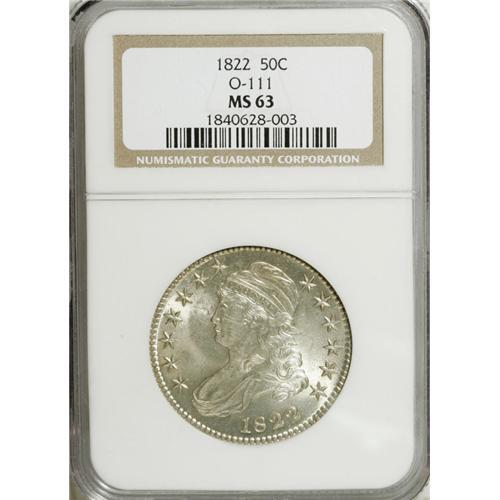 <B>1822 50C MS63 NGC.</B></I> O-111, R.2. There is a prominent center dot on Liberty's neck, and noticeable die rust creates rough patches beneath the eagle's wings. Boldly struck and highly lustrous, with silver-gray color and a few small splashes of russet and apricot on the reverse. A few superficial field blemishes limit the grade.<BR><BR><b>Shipping:</b> Coins & Currency (<a target="_blank" href="http://www.heritageauctions.com/common/shipping.php">view shipping information</a>)