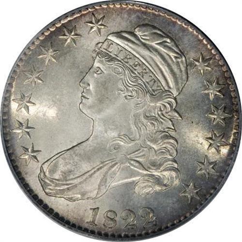 <B>1822 50C MS63 PCGS.</B></I> O-113, R.3. The aesthetic qualities of this 1822 Bust half are usually reserved for coins of a higher grade. The rich luster is unbroken, save for a coupe of tiny interruptions in the left obverse field, and a light amber tone gracefully adorns the attractive surfaces, which have a semiprooflikeness under the mint frost. An incredible hammer strike and virtual lack of any distracting abrasions complete the positive features of this eye-appealing Bust half. Expect fierce bidding competition. Population: 52 in 63, 51 finer (12/07).<BR><BR><B>Coin Engraver:</B> John Reich<BR><BR><b>Shipping:</b> Coins & Currency (<a target="_blank" href="http://www.heritageauctions.com/common/shipping.php">view shipping information</a>)