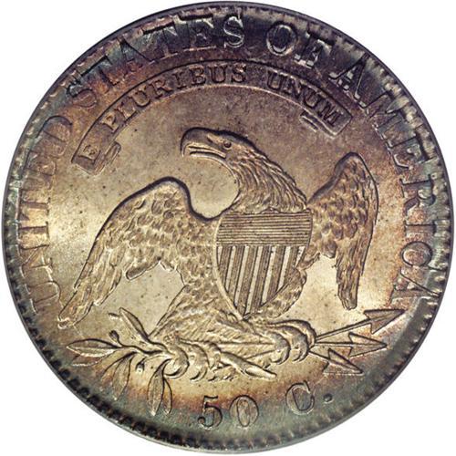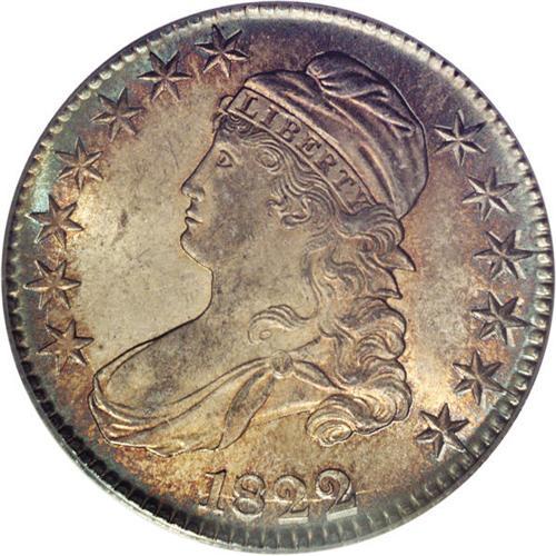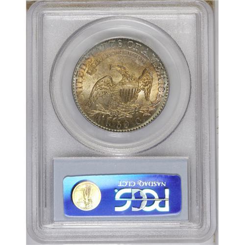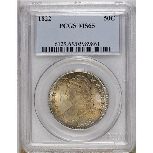<B>1822 50C MS65 PCGS.</B></I> O-106a, R.3. Beautiful golden-brown and aquamarine toning endow this lustrous and refreshingly smooth Gem. Well struck aside from a few knuckles on the claws. Late dies with a series of hair-thin die cracks throughout both peripheries. Population: 8 in 65, 4 finer (12/06).<BR><BR><b>Shipping:</b> Coin/Currency (<a target="_blank" href="http://www.heritageauctions.com/common/shipping.php">view shipping information</a>)