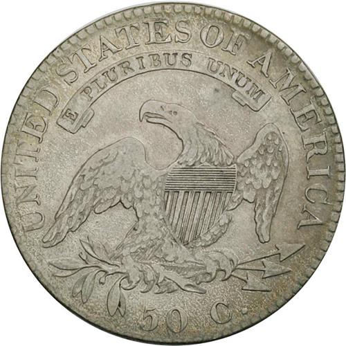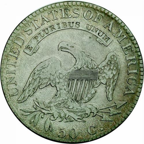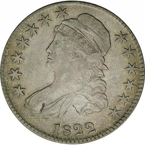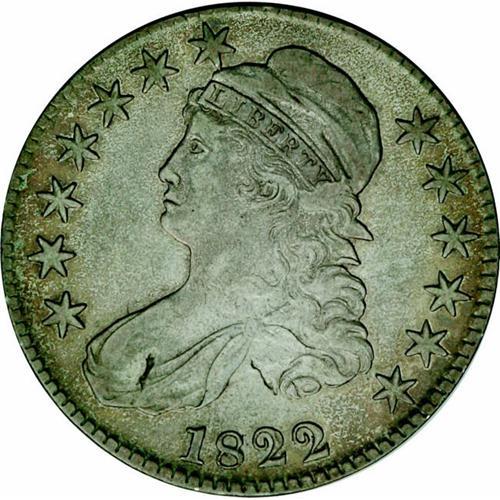 <B>1822<50C>--Damaged--NCS. XF Details.</B></I> O-109, R.2. Star seven on this obverse is imbedded into the liberty cap, while on the reverse the inside right serifs of the A's are missing. This coin is dark, with fine greenish-gray toning covering both sides. A couple of severe digs are on the obverse, one near the bustline and a second near the lowest hair curl. The strike is a bit soft, but some faded mint luster remains. Envelope Included.