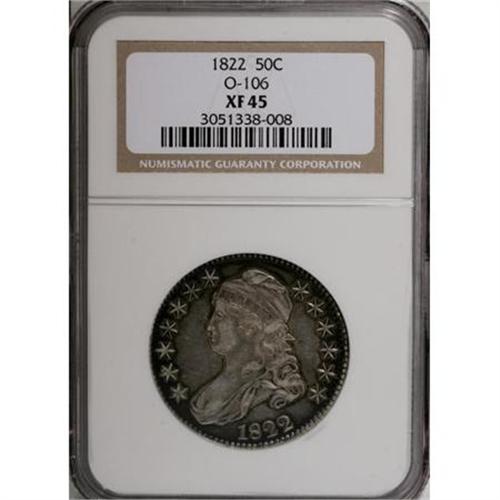<B>1822 50C XF45 NGC.</B></I> O-106. NGC Census: (49/366). PCGS Population (46/366). Mintage: 1,559,573. Numismedia Wsl. Price for NGC/PCGS coin in XF45: $268. (#6129)<BR><BR><B>Coin Engraver:</B> John Reich<BR><BR><b>Shipping:</b> Coins & Currency (<a target="_blank" href="http://www.heritageauctions.com/common/shipping.php">view shipping information</a>)