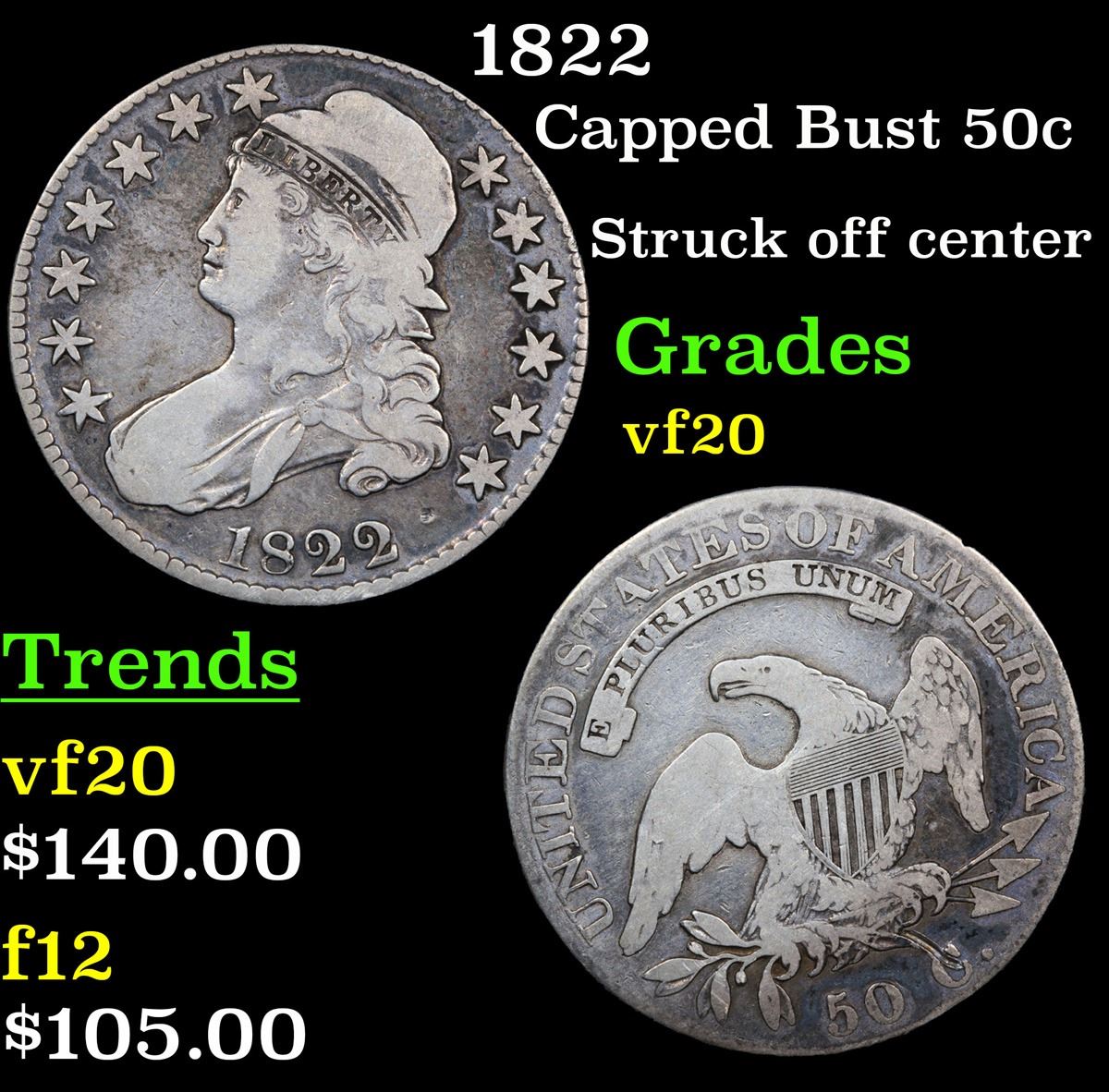 1822 Struck off center . Capped Bust Half Dollar 50c Grades vf, very fine.