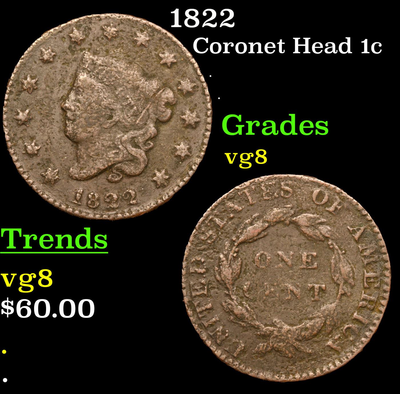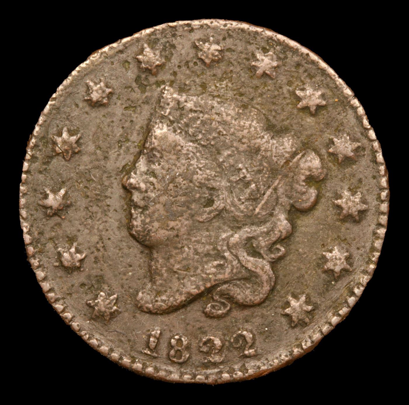 1822 Coronet Head Large Cent 1c Grades vg, very good.